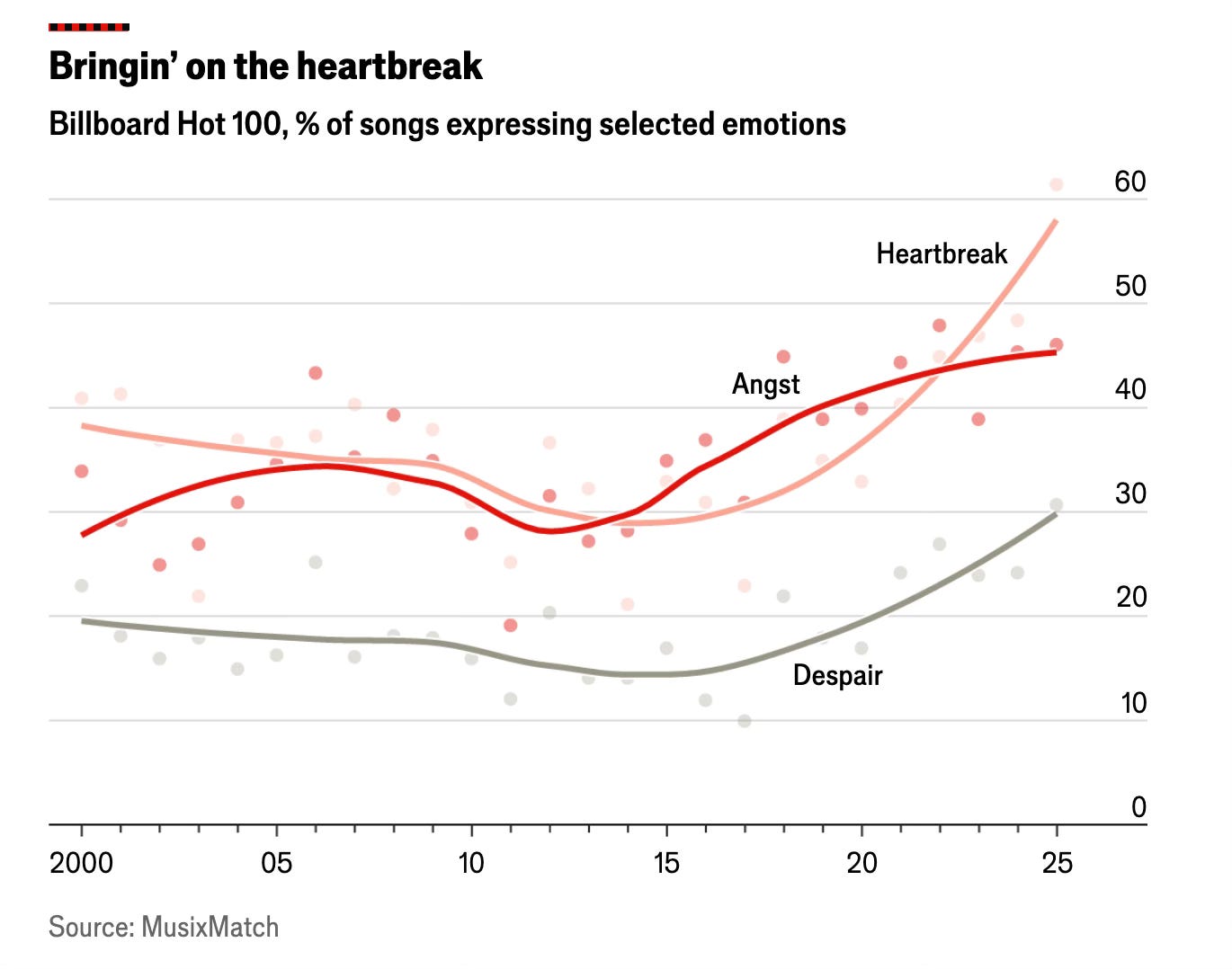 La musica pop sta diventando più cupa, dice un’analisi di MusixMatch per l’Economist (paywall). La percentuale di canzoni di successo con testi che evocano l’angoscia è aumentata di 13 punti percentuali negli ultimi due decenni, a pari merito con il dolore per “cuore infranto”. Anche la “disperazione” ha iniziato ad aumentare notevolmente dopo il 2020.