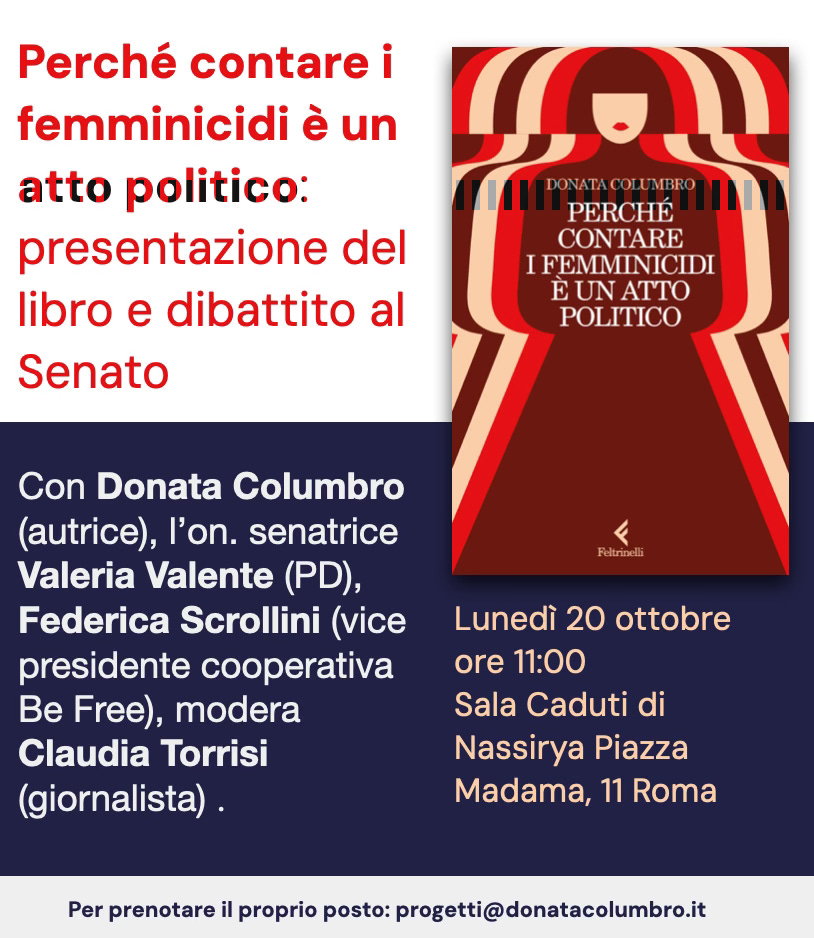20 ottobre, Roma: al Senato alle 11 in dialogo con la senatrice PD Valeria Valente, la giornalista Claudia Torrisi e Federica Scrollini dell’associazione BeFree. Per venire a seguire di persona devi comunicarmi il tuo nome via mail (progetti@donatacolumbro.it). L’evento sarà anche disponibile in diretta qui e sul canale Youtube del Senato.