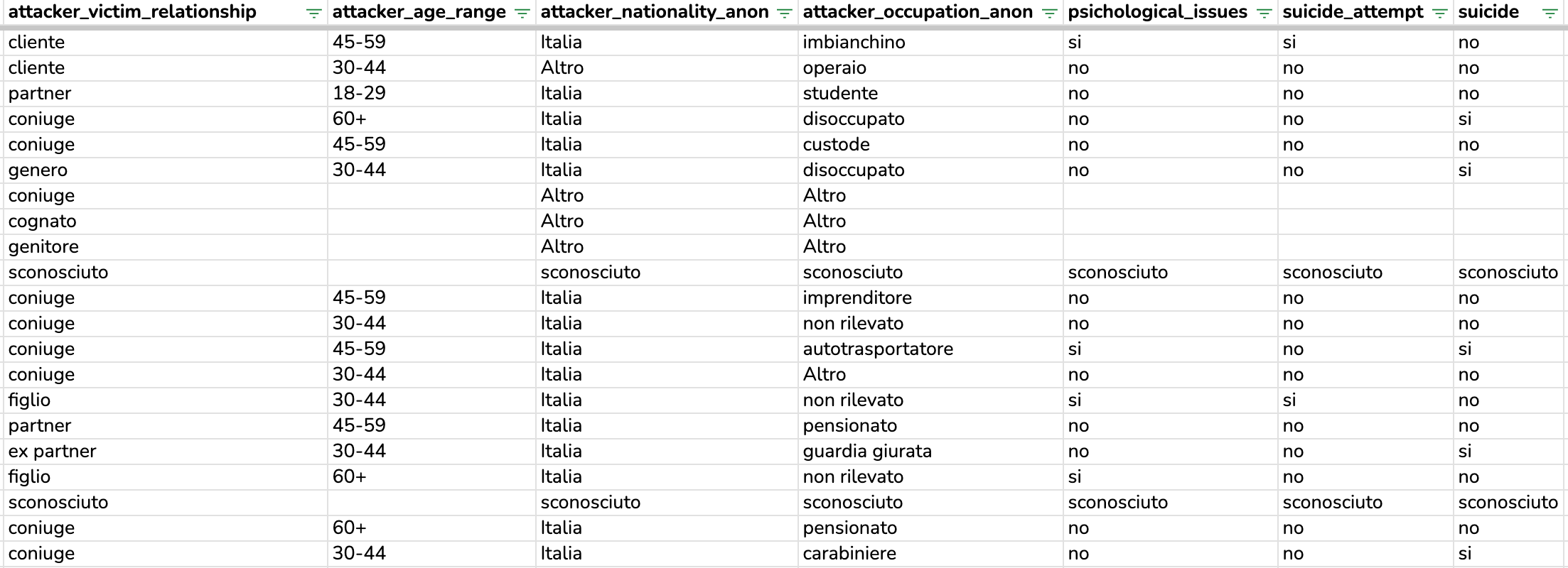 Le vittime sono descritte in termini di genere e fascia d’età, nazionalità e, quando disponibile, occupazione. È anche indicato se avevano figli. L’aggressore è descritto in modo analogo: età approssimativa, nazionalità, occupazione, e in alcuni casi viene segnalata la presenza di problematiche psichiche. Sono presenti anche due variabili che indicano se l’aggressore ha tentato o commesso suicidio in seguito all’evento.