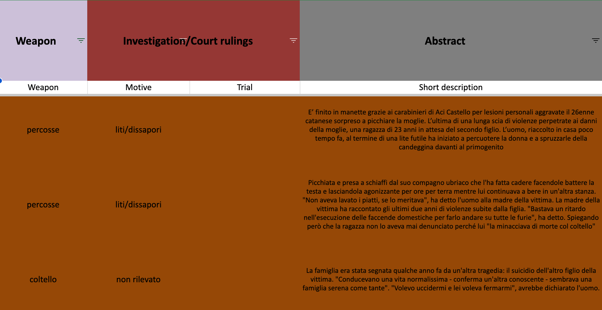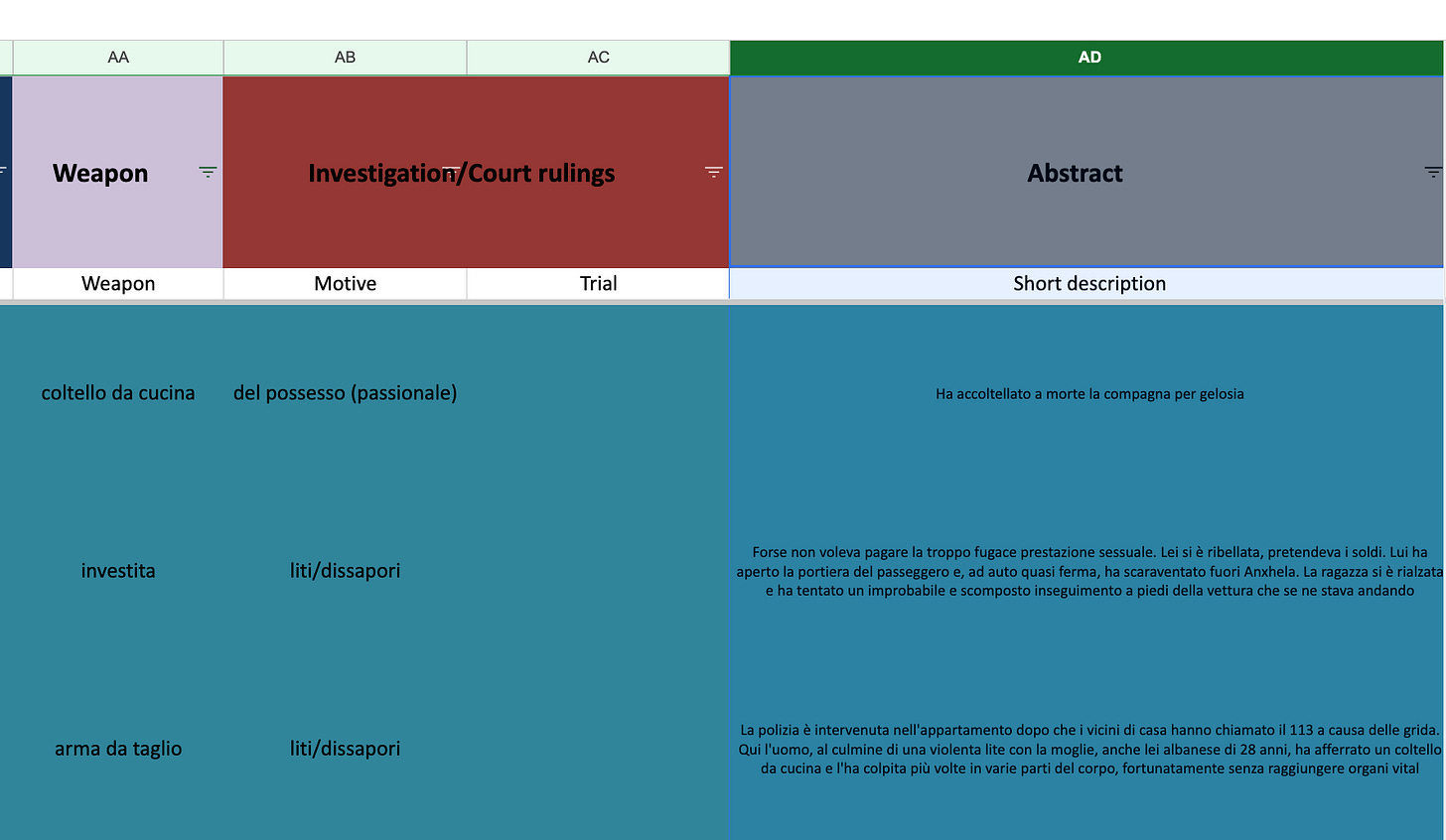 Anche questo mi chiedo mentre esploro riga per riga gli oltre 800 eventi di omicidi di donne registrati tra il 2012 e il 2017 in Italia.