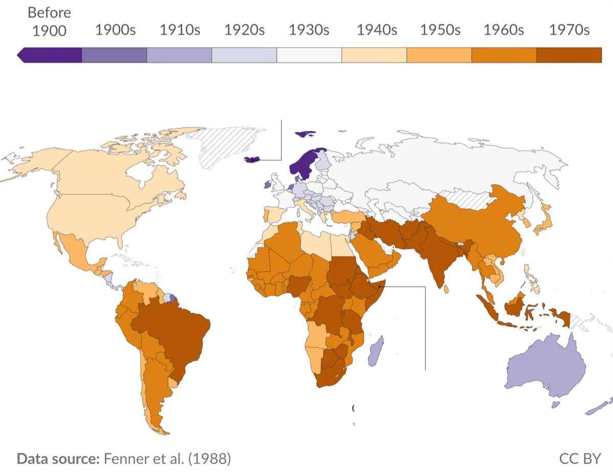 Perché racconta la storia di come abbiamo debellato il vaiolo: il mondo è stato dichiarato ufficialmente vaiolo-free nel 1980, con la Somalia come ultimo stato “liberato” nel 1977. (la prima era stata l’Islanda, nel 1872). La versione originale di questa mappa, correttamente descritta e annotata, è sul sito di Our World in Data. L’ho messa qui all’inizio della newsletter per ricordarci che certe cose molto brutte che crediamo eterne possono comunque sparire per sempre.